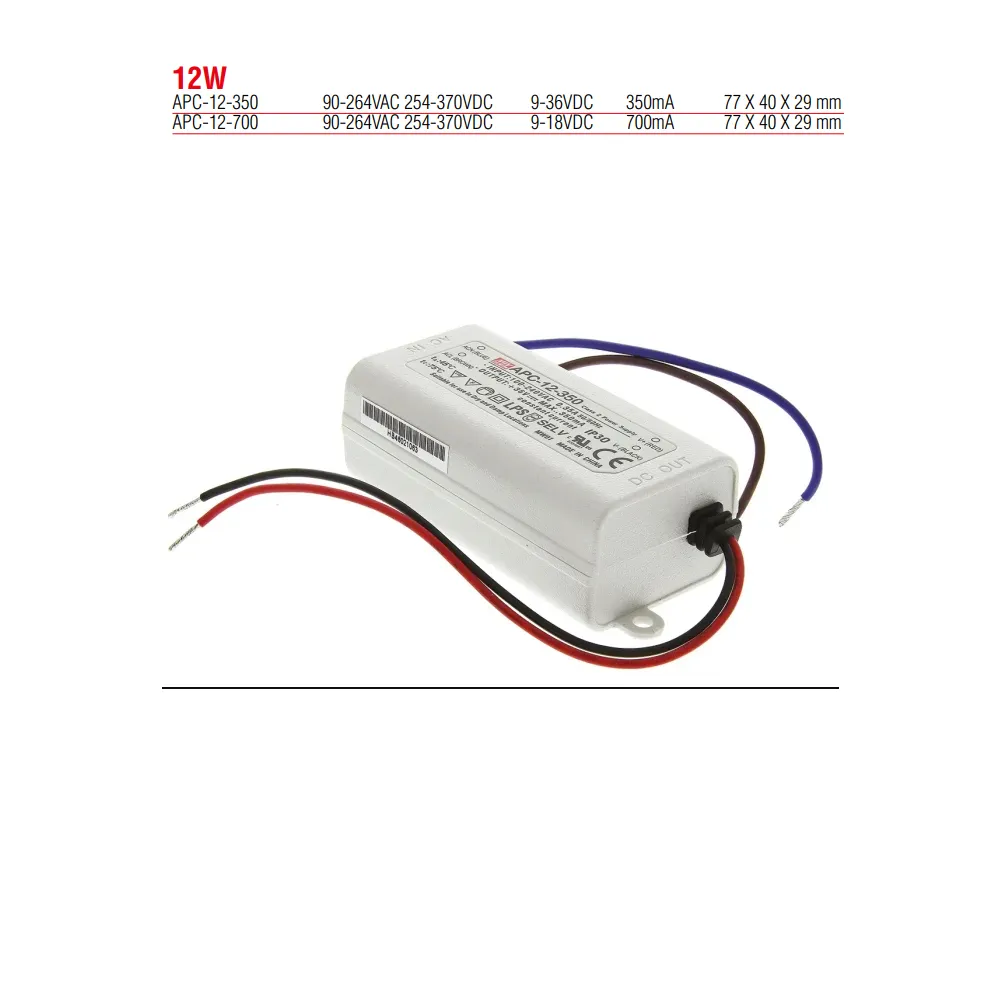 12w, Sabit Akım Ve Evrensel Giriş İle Plastik Bir Muhafaza (Ip42) İçinde Led Sürücüler. Bu Cihazlar Led Aydınlatma Uygulamalarına Uygun Olup, Aşırı Gerilim Ve Kısa Devreye Karşı Korumalıdır. Kısılabilir Değildirler Ve Ul8750 İle Uyumludurlar. Bu Mean Well Serisinin Şu Türlerini Sunuyoruz: Apc-12-350 Ve Apc-12-700.