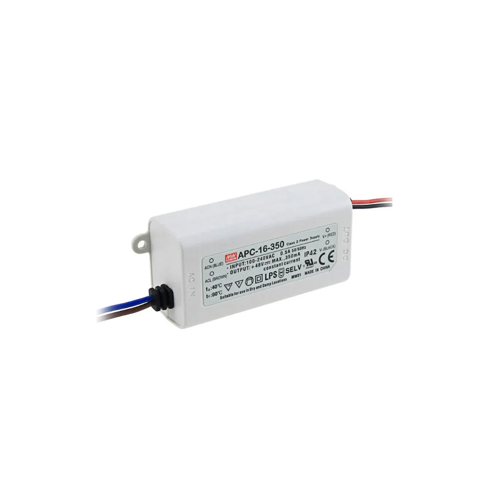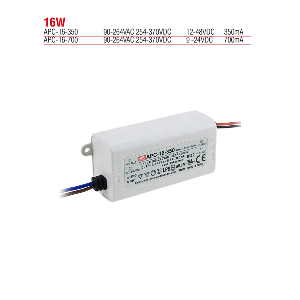 16,8 W, Sabit Akım Ve Üniversal Giriş İle Plastik Muhafaza (Ip42) İçinde Led Sürücüler. Bu Cihazlar Led Aydınlatma Uygulamaları İçin Uygundur Ve Aşırı Gerilim Ve Kısa Devreye Karşı Korumalıdır. Kısılabilir Değildirler Ve Ul8750, Iec61347-1, Iec61347-2-13 Ve En55032 İle Uyumludurlar. Bu Mean Well Serisinin Şu Türlerini Sunuyoruz: Apc-16-350 Ve Apc-16-700.