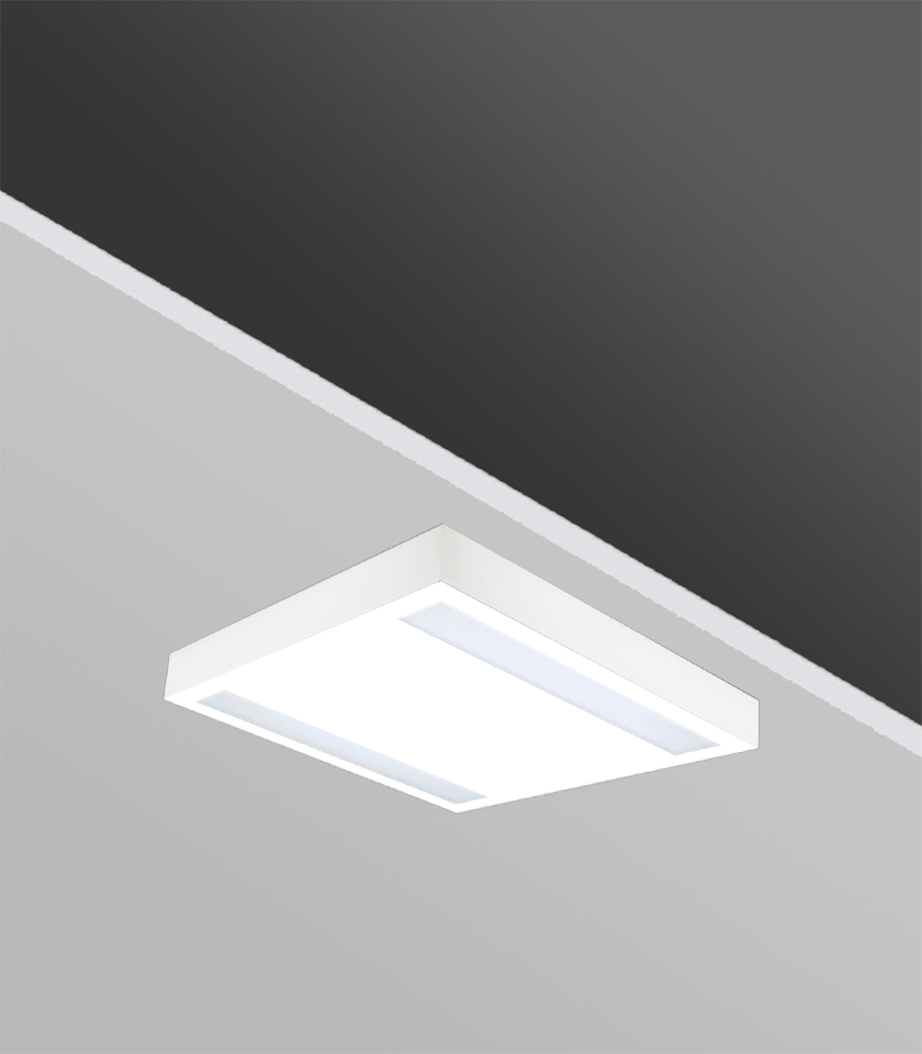 Difüzör ve plastik çerçeve tasarımlı bireysel ve homojen aydınlatma sağlayan sıva üstü armatür.
